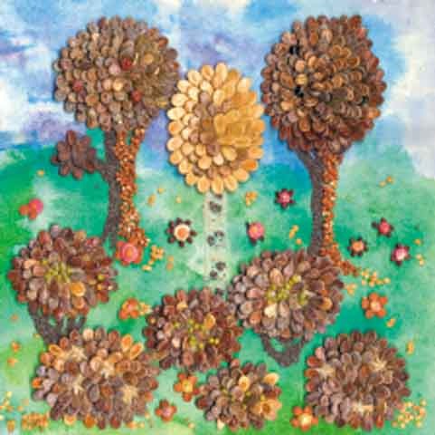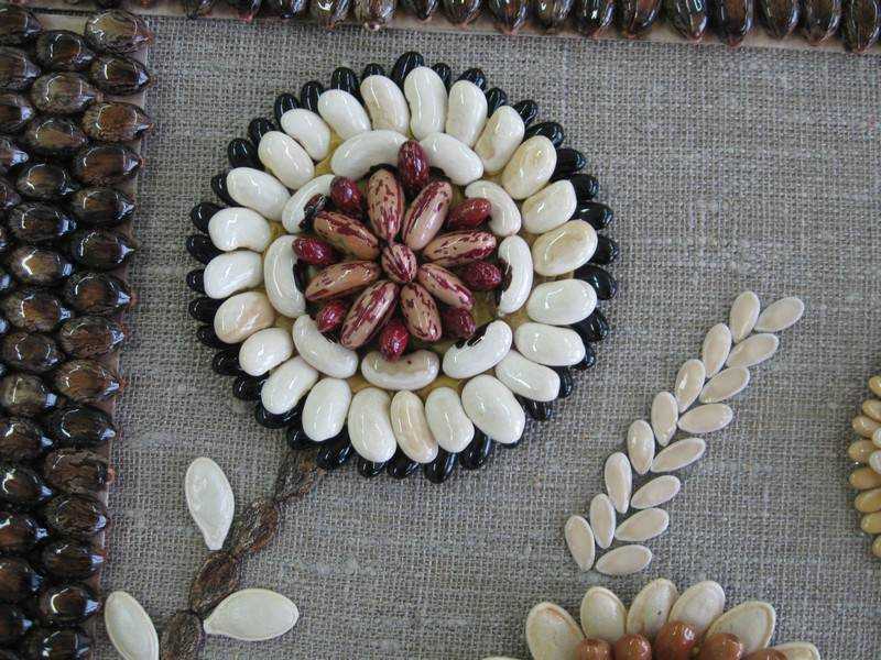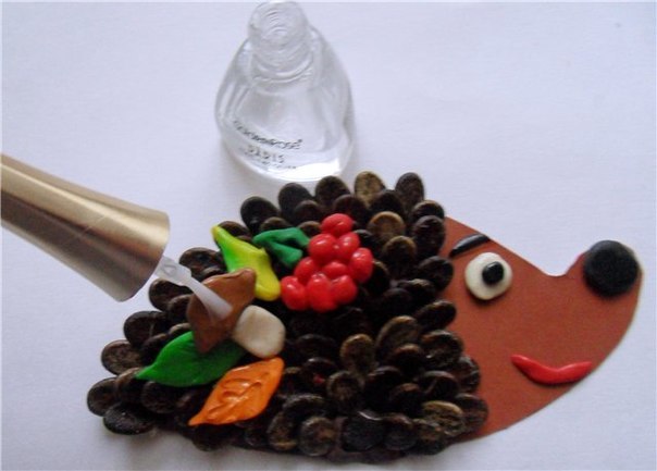 Нужную часть листа покрывают клеем. После аккуратно располагают семечки, не оставляя между ними свободного пространства. Когда поделка высохнет, ее можно вставить в рамку, украсить ею детскую.
