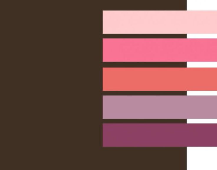 Сочетание розового и шоколадного можно назвать сладкой парочкой, где розовый цвет ассоциируется с ягодным кремом, мороженным, суфле и др. В гамме предпочтительны светлые, нежные, теплые оттенки розового, которые не только контрастируют с темным тоном, но и его значением. Например с розово-персиковым, сакурой, клубничным, закатным, кораллово-розовым.