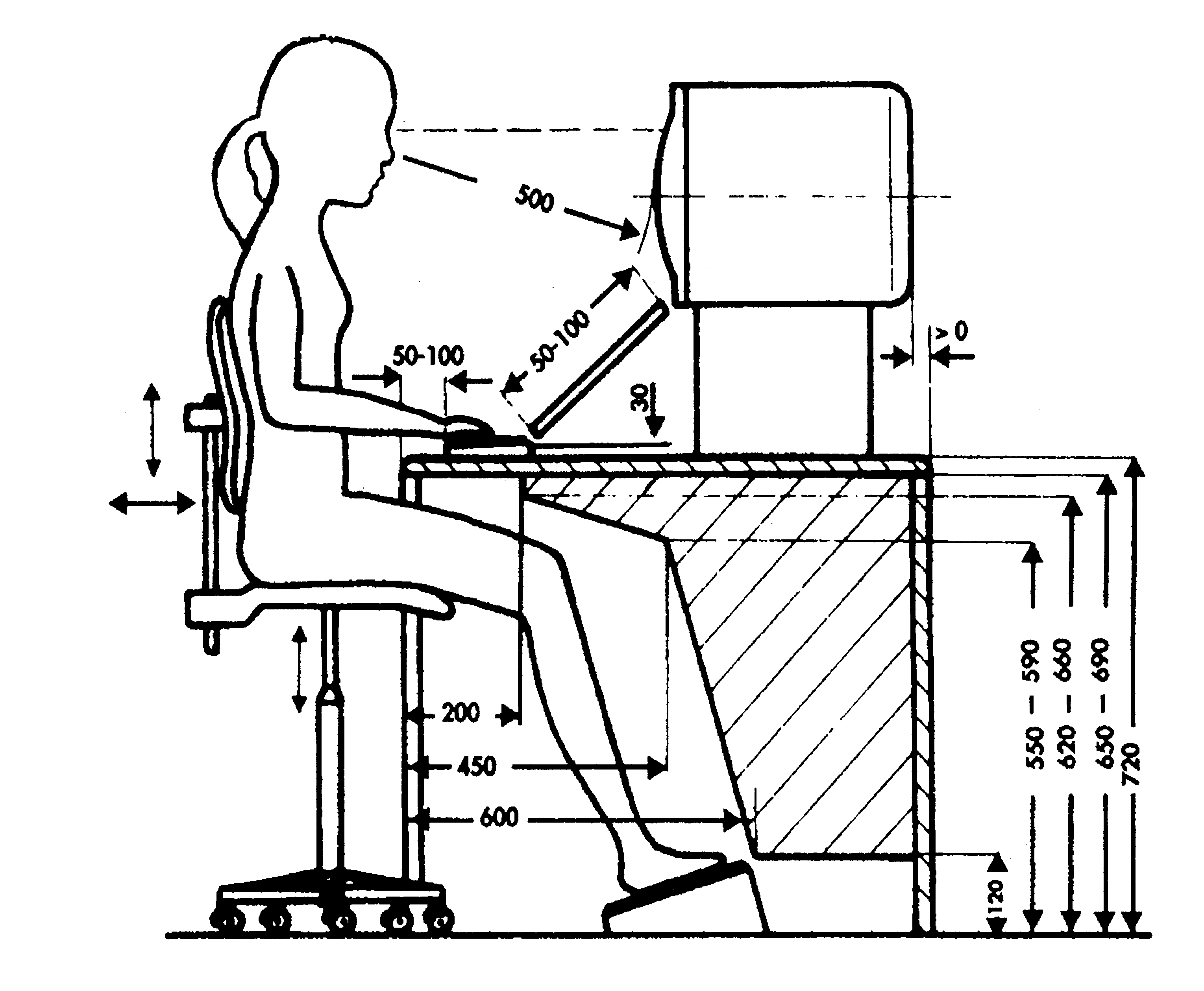 - На вашем рабочем месте должно быть пространство выше колен, а также такая высота клавиатуры, чтобы ваши плечи и руки находились в нейтральной позе с минимальным напряжением, о которой говорилось выше.