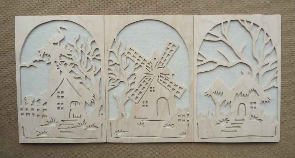 Эти работы представляют собой многослойную конструкцию, где каждый слой несет определенную смысловую нагрузку. Вырезанные по отдельности орнамент, элементы пейзажа, фигурки людей/животных и прочая, приклеиваются друг на друга в определенном порядке, образуя оригинальную композицию.