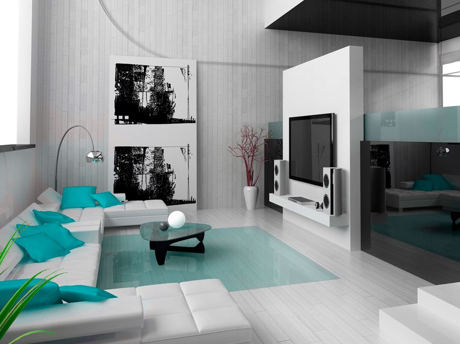 д. Они комбинируются между собой, создавая преимущественно холодную гамму цвета. - Дизайн тяготеет к минимализму, все лишние предметы и отдельные виды техники, спрятаны, показывая внешнюю простоту комнаты.