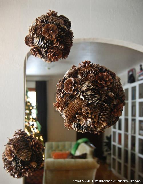 Кроме всего перечисленного, шишками можно декорировать любую готовую вазу или другую уже не нужную емкость, сделав из неё великолепный элемент декора интерьера.