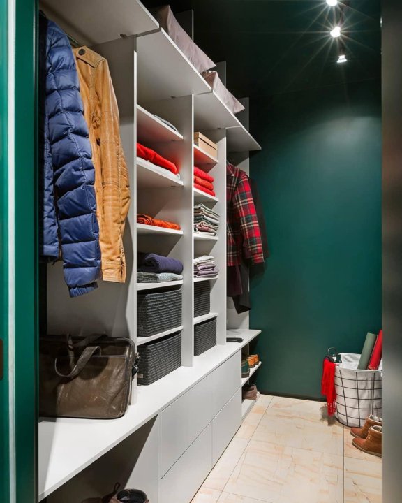 Обычно гардеробная — это помещение без окон с глухими стенами и только одним входом. Отсутствие естественного освещения и достаточной вентиляции может вызвать неприятный запах и дискомфорт в использовании, опасность. В царящем внутри полумраке довольно сложно найти вещь, поэтому лучше сделать искусственное освещение.