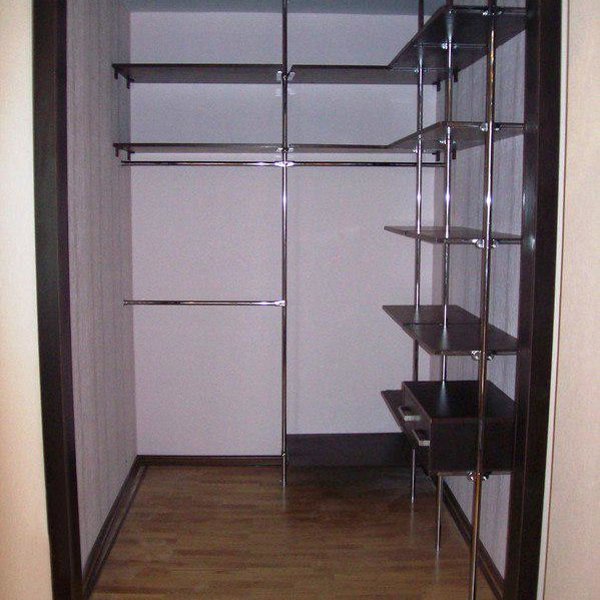 Оптимальным решением для каждой гардеробной считается такой специальный стеллаж. Он прекрасно вписывается даже в маленькую комнату, а также собрать его не составит труда. Он вовсе может быть сделан самостоятельно из ДСП или других доступных и простых в обработке материалов. Имеется множество фотографий с этой конструкцией, поэтому можно убедиться в привлекательном внешнем виде таких гардеробных.