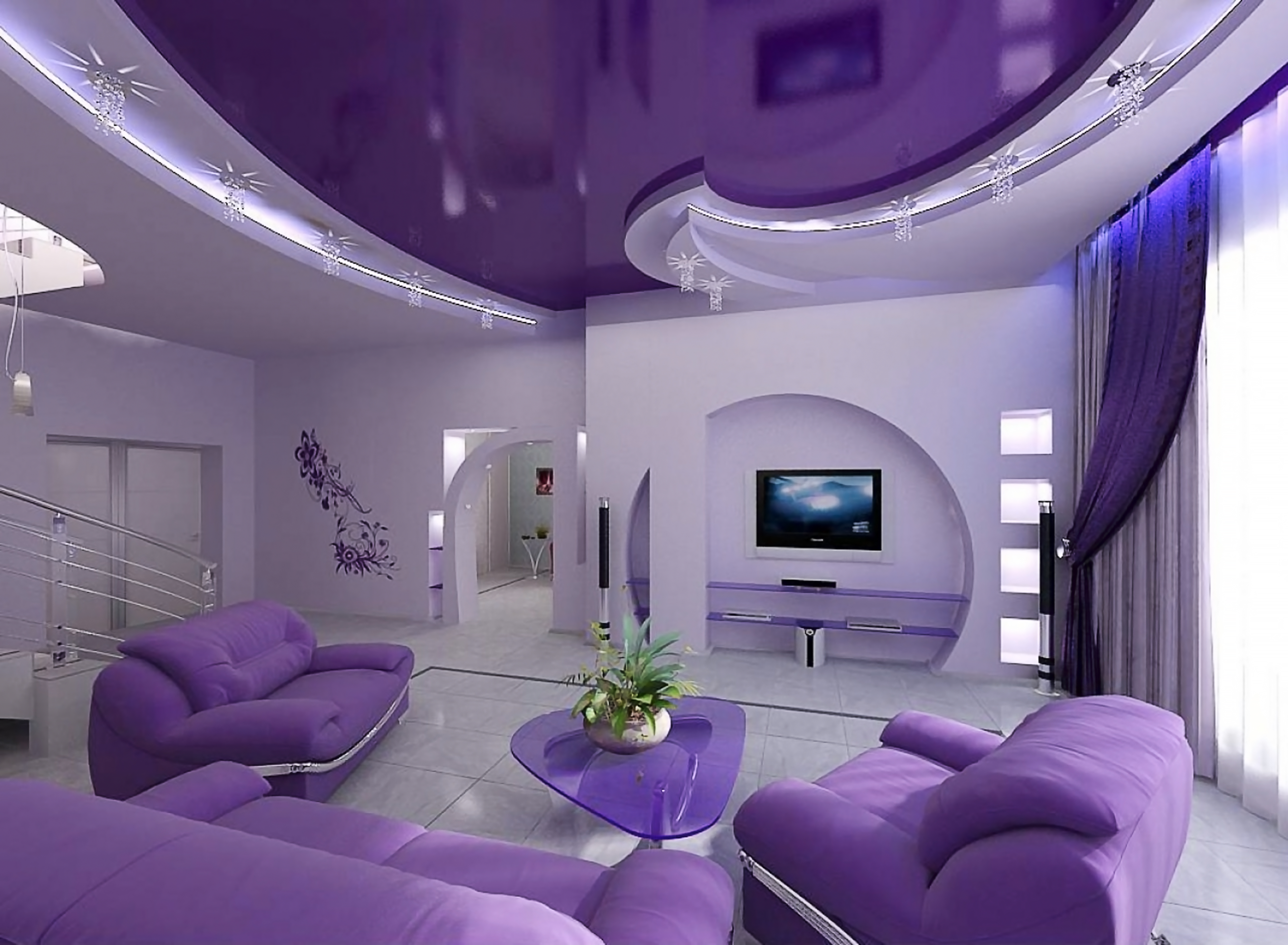 Поклонники арабского стиля могут оклеить стены фиолетовыми обоями с кружевным принтом, выбрать аналогичный цвет для натяжного потолка и пола.