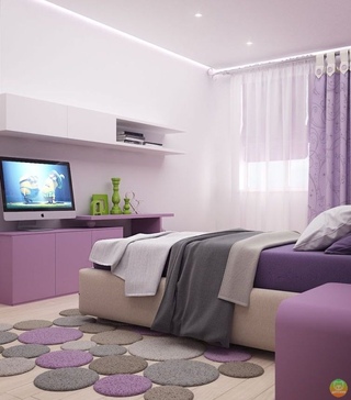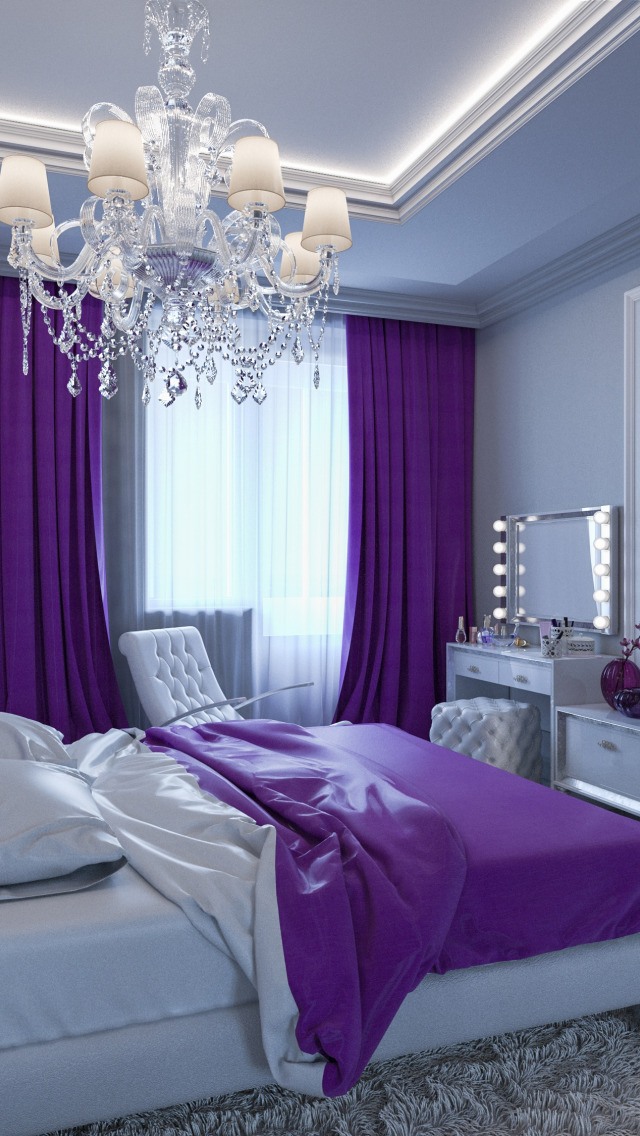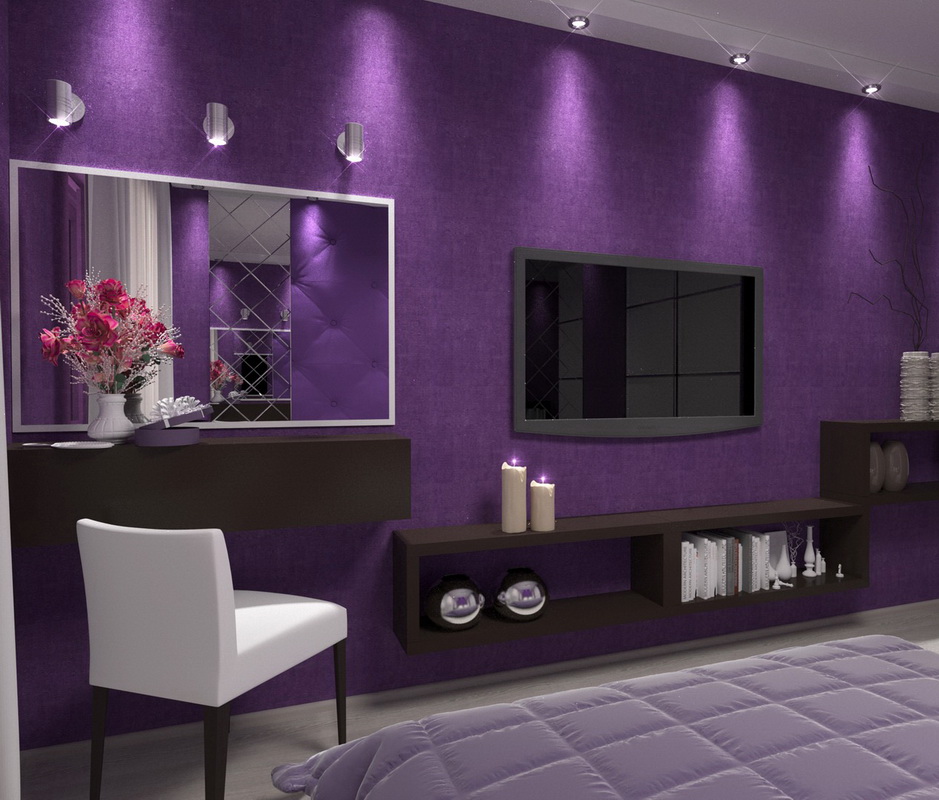 Фиолетовый оттенок идеален для детей и молодых натур, но совершенно противопоказан пожилым людям. В интерьере спальни он будет навевать депрессию и грусть. Фиолетовый цвет способен внести в интерьер ощущение прохлады, поэтому он с успехом используется в спальнях жителей жарких стран, а также показан тем, кто не приемлет жару или имеет проблемы с органами дыхания (снимает напряжение, связанное с дыханием).