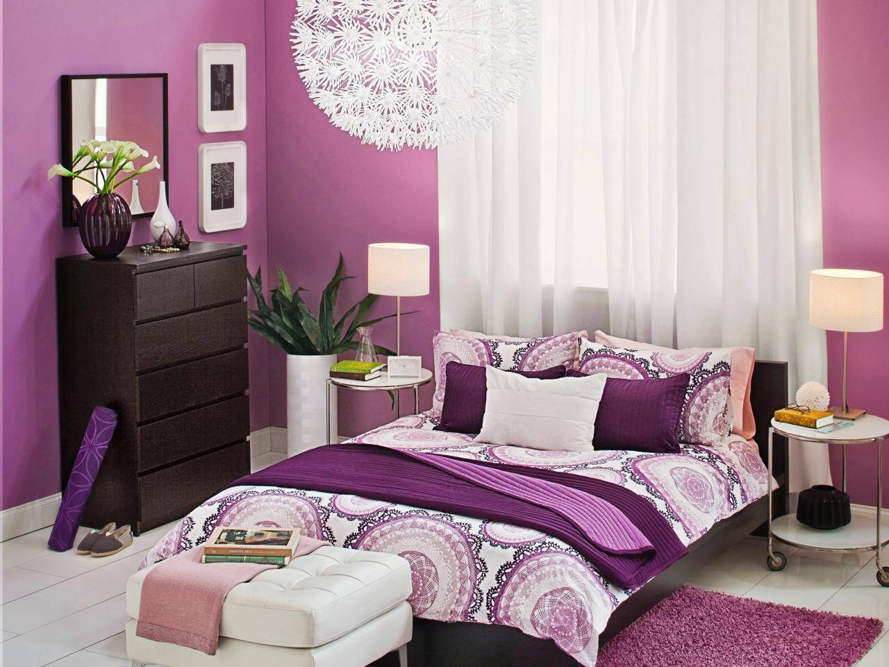 Здесь вы можете видеть, что шторы фиолетовые, но на кровати используются розовые одеяла и подушки.Кроме того, вы также можете увидеть оттенок розового на вазе и пластмассовом цветочном декоре. Более того, настоятельно рекомендуется выбрать в качестве основы белый цвет.