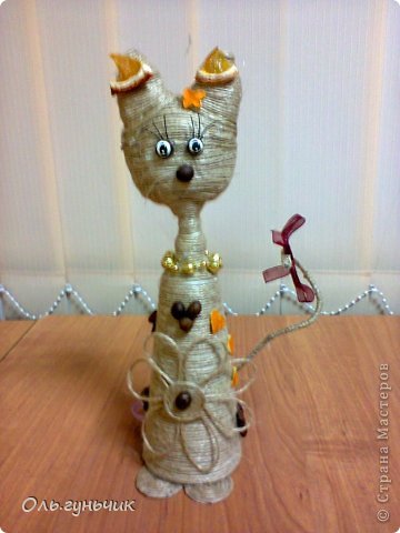 На покрытую силиконовым клеем бутылку наматывать шпагат, начиная с нижней ее части и заканчивая самым верхом. Тщательно следить за плотностью и аккуратностью витков.