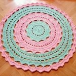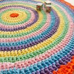 - крючком круглый половик вяжется от центра столбиками с накидом или без. Прибавки производятся в каждом ряду, по 6-8 петель. Высота одного ряда – до двух см, каждый из них можно выполнить в разном цвете;
