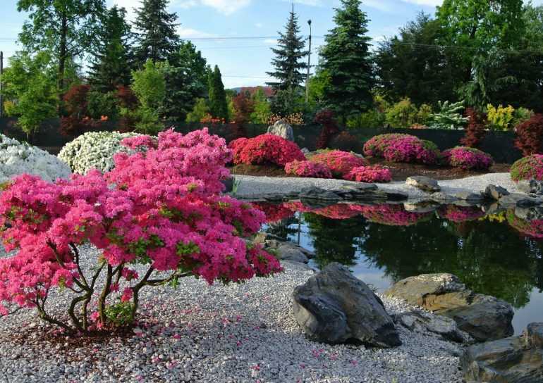 Среднерослые кустарники рододендроны часто выступают в качестве групповых посадок на фоне изумрудного газона или хвойных насаждений.