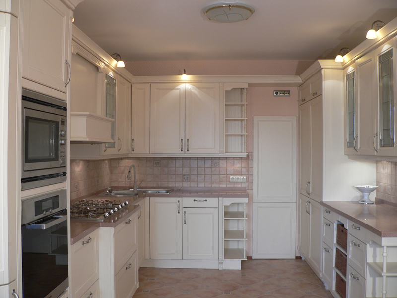 Такой подход к обустройству кухни идеально сочетается с основной концепцией двухрядной планировки. Если есть желание, можно выбрать и более традиционные стили — классический, прованс, кантри, шебби-шик, средиземноморский.