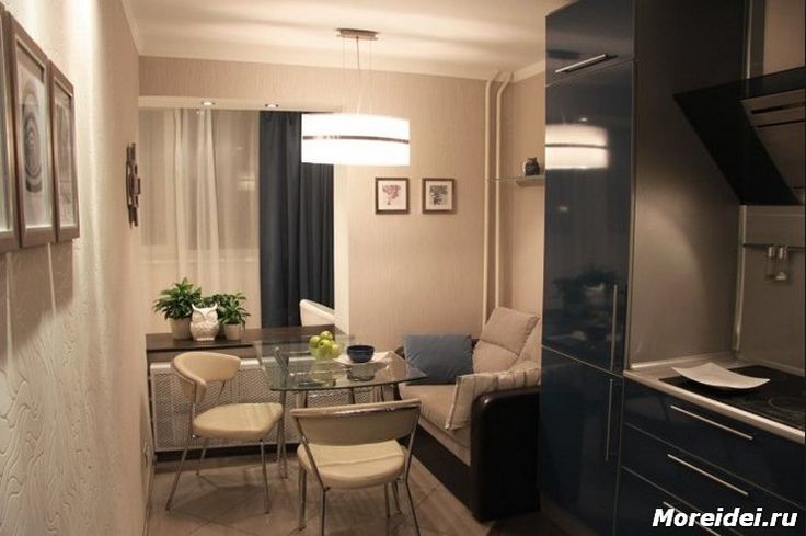 По идее, в такое помещение войдет любая мебель кроме особо габаритной. Но нужно ли столько? Если кухонной посуды, кастрюль и техники не много, то лишние навесные шкафы и напольные тумбы ни к чему. Лучше оставить место для организации обеденной зоны с диваном и стульями.
