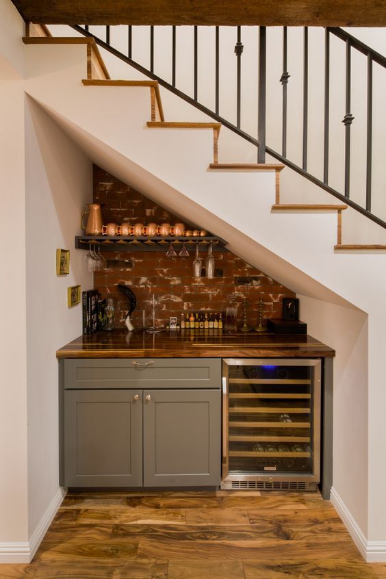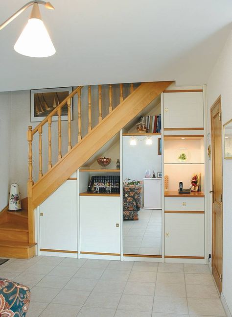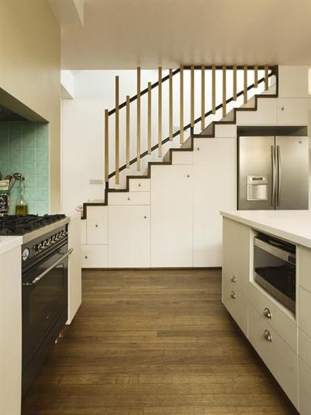 Хорошая идея: Встроенный шкаф — это удобно и вместительно. Пускай по форме он повторяет ступени — так у вас будет множество ячеек для хранения кухонных мелочей.