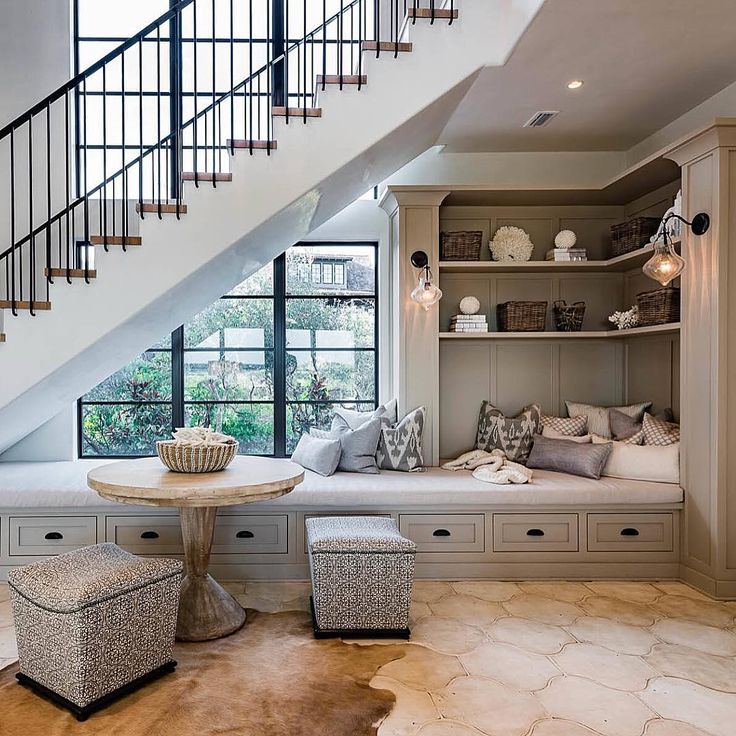 - Продумайте, как использовать подлестничное пространство: возможно, туда органично встроятся шкафы или даже полноразмерный гарнитур;