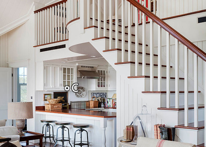 Если сходни ведут на открытый второй уровень, расположите кухню внизу, а наверху сделайте столовую или гостиную. Постарайтесь подобрать перила верхнего этажа так, чтобы они сочетались с декором лестницы.