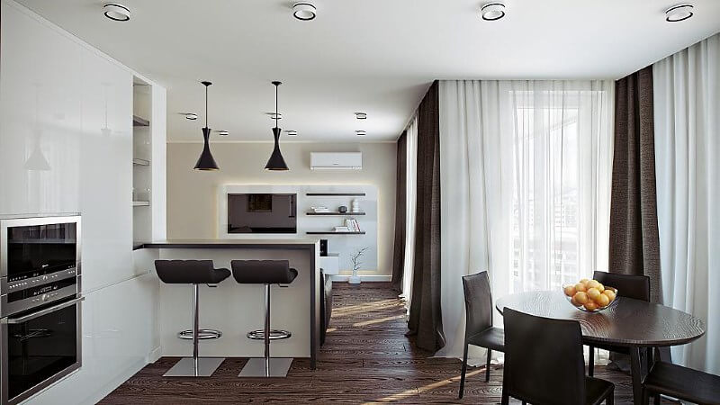 Барная стойка, кухонный остров делают интерьер декоративным и удобным одновременно. Зонирование с помощью большого обеденного стола, дивана. Функциональное решение, но в маленьком пространстве этот прием нужно использовать осторожно. Иначе вы рискуете «заставить» свободное пространство.