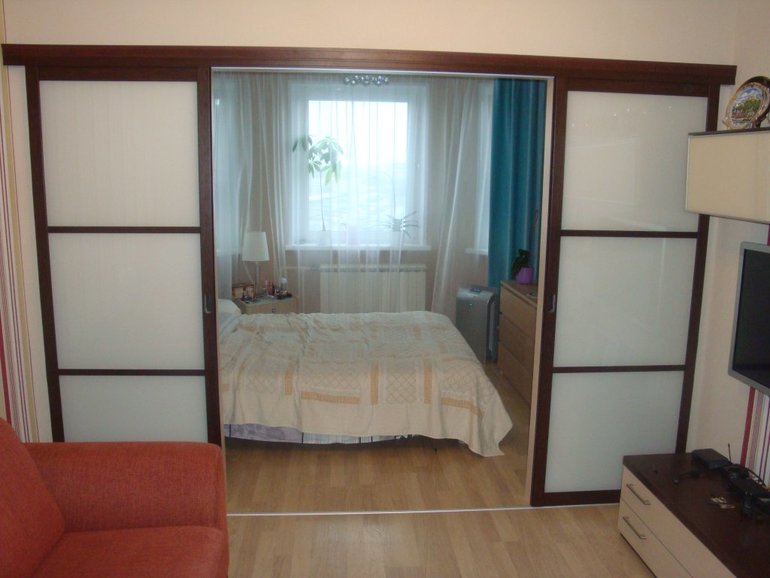 Чаще встречаются стандартные комнаты с одним окном в торце. Такую невозможно разделить на зоны стенкой с сохранением полного естественного освещения в обеих. Проблема частично решается с помощью перегородок из стекла или оргстекла. Ширмы и шторы из плотного материала тоже дают значительную изоляцию, обеспечивая днем объединение зон и свет во всем помещении.