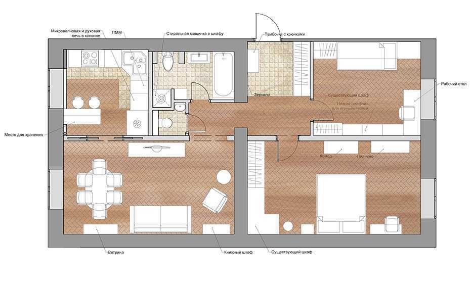 Если есть возможность сделать так, чтобы 3-х комнатная квартира стала двухкомнатной, то это идеальное решение. К сожалению, с распашонками такой вариант не проходит, поскольку стены между комнатами несущие. В то же время есть возможность перепланировать помещение кухни, совместив его с гостиной, или сделать широкий проем из комнаты. Также можно организовать гардеробную из кладовки, если таковая имеется, и части коридора.