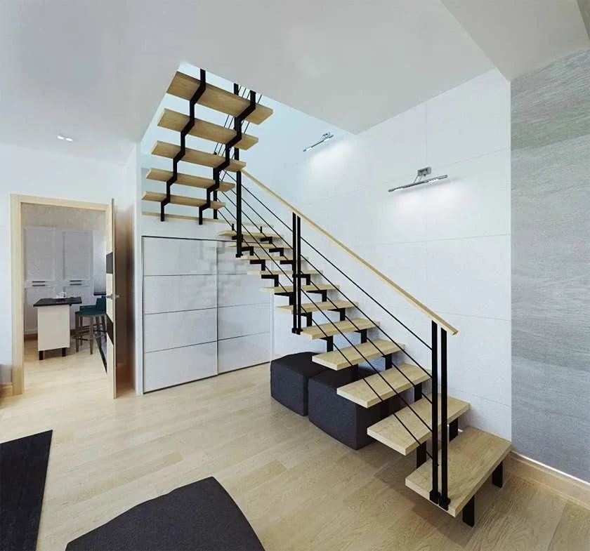 Такая лестница отличается явной громоздкостью, однако есть один плюс – внизу под ступенями можно сделать чулан. Данный вид лестниц, как правило, имеет геометрически правильную форму.