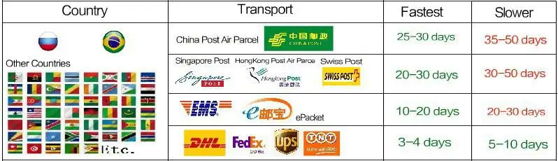 Мы примем разные каналы в соответствии с характеристиками грузоперевозок. Она может достигать более чем 200 стран и регионов. Мы обещаем, что все заказы будут выдаваться в течение четырех дней. Так как время отслеживания различных каналов будет различно, почтовые посылки, обычно показывают 1-4 дней для международной экспресс-доставки, и если есть заторы, информация отслеживания времени будет расширена.