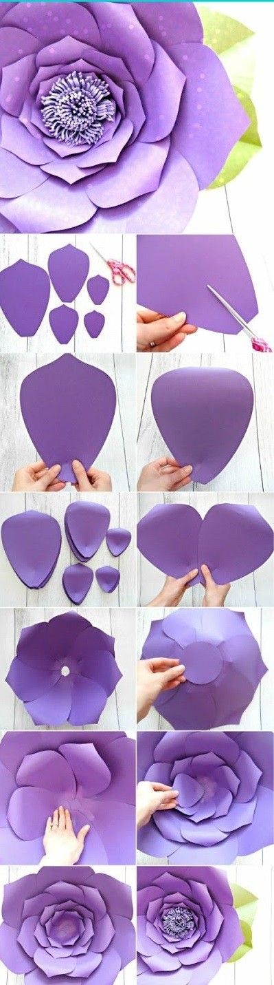 Чтобы эти объемные большие цветы из бумаги были более яркими, при изготовлении одной поделки следует использовать несколько оттенков. Можно даже совмещать синий и красный материал, фиолетовый и розовый, оранжевый и бордовый.