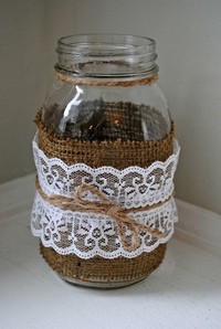 Мешковиной можно оборачивать стеклянные емкости полностью, а можно использовать полоски, фиксируя их клеем, кружевом или шпагатом.