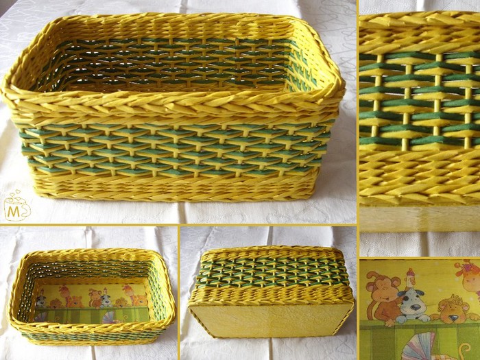 Чаще всего плетение из бумажных палочек имитирует плетение из лозы, применяется для изготовления интерьерных корзинок и коробок. Если их покрыть лаком, они не будут бояться воды и станут прочными.