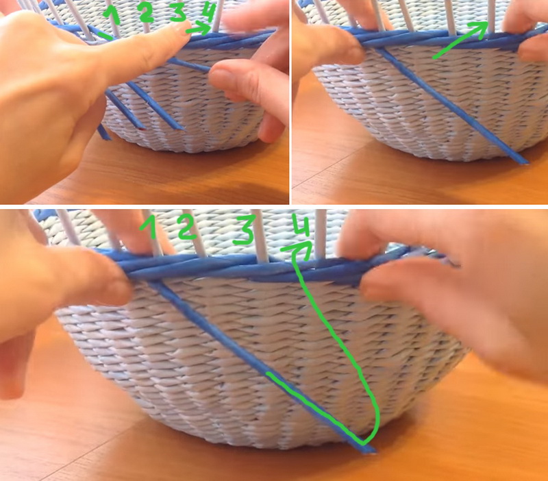 Трубка проходит под первой парой стоек, затем над второй и так далее. Когда трубка закончится, вы можете вставить в нее другую или спрятать кончик и приклеить другой. В конце круга кончик спрятан внутрь корзины.