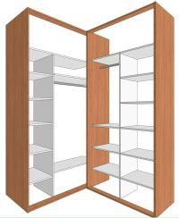 Планировка наполнения должна выполняться поэтапно. В трапециевидных и треугольных моделях, где углы скошены, сложно использовать узкие треугольники. Оптимально организовать здесь хранение небольших вещей на полках или устроить хранение зонтов, лыж, других подобных предметов. В углу шкафа обычно находится отделение для одежды на плечиках, если в конструкции нет посередине перегородки, то вместо нее используется шест, куда крепятся перекладины.