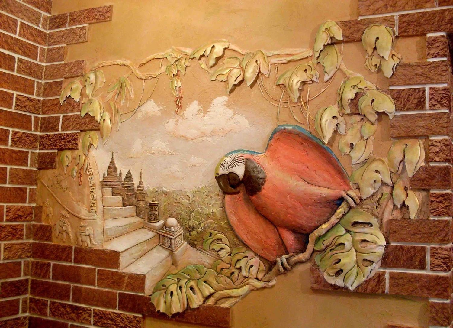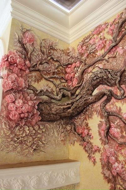 Последний тип такого декора подойдёт только тем, кто обладает художественным талантом – создать объемный рисунок на стене своими руками. При этом, есть несколько техник, включающих в себя не только использование красок. Можно создать картину из декоративной штукатурки, вылепить ее из гипса или использовать метод аппликации – способов очень много.
