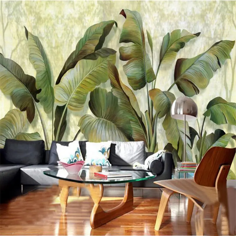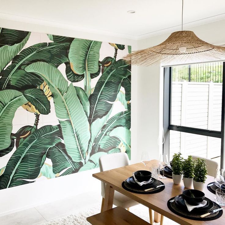 Намальовані листя банана або патерн підійдуть для створення не нав’язливого і модного образу в квартирі або офісі. Листя з квітами і барвистими папугами стануть яскравим акцентом в дитячій кімнаті.