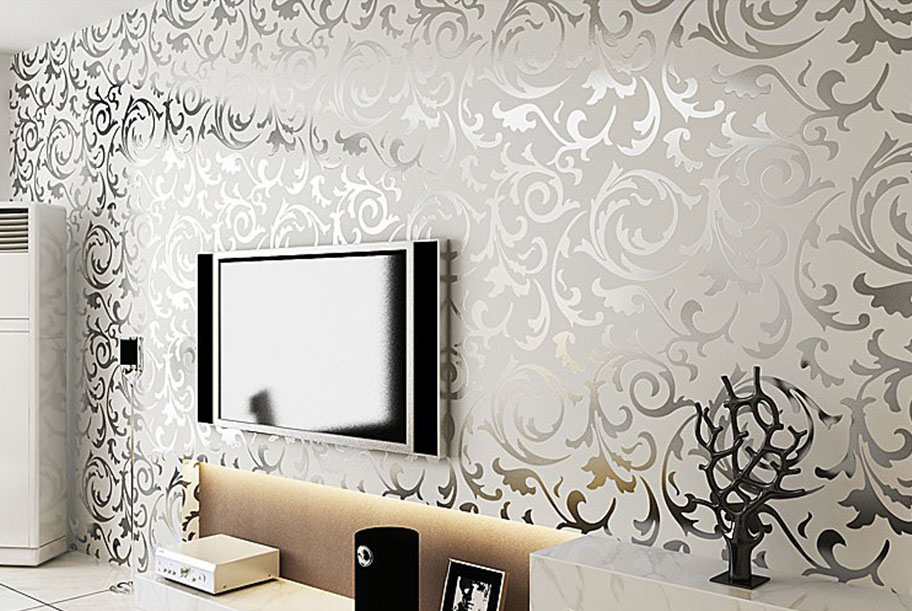 Комбинируя серебристый орнамент и фактуру полотна можно кардинально изменить настроение и стиль помещения. В большинстве классических направлений работающих под старину, серебро добавляет роскоши и выглядит богато. - Различные оттенки серого неизменно присутствуют в объемных, выбитых орнаментах стилей барокко и классицизм. Их выгодно дополняют зеркала различной конфигурации, канделябры и витые, стилизованные люстры.