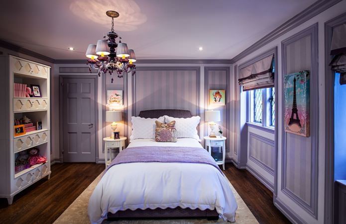 Сиреневые полосы используются в средних и больших комнатах, сочетаются с лимонным, серым, розовым, белым цветом.