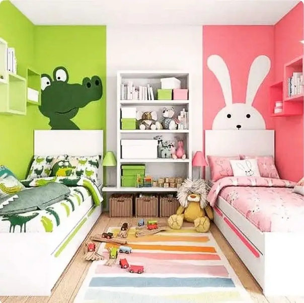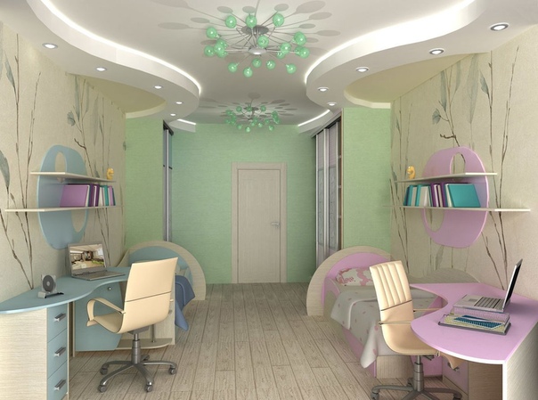 Очень часто для комнаты девочки выбирают розовые цвета, а для мальчика — голубые. Но из законов колористики следует, что голубой цвет слишком холодный для детей, а розовый часто вызывает раздражение у мальчиков-подростков, усугубляя течение переходного периода. Ввиду этого, все же в общей комнате не стоит злоупотреблять данными цветами, используя их только в качестве акцентов.