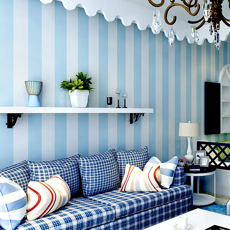 32. Обои в небесно-голубую и эгейскую полоскуЭти обои из мешковины двух оттенков синего выглядят стильно, стильно и модно. Современная и модная декоративная бумага создает спокойную атмосферу и идеально подходит для украшения ваших библиотек, детских комнат и гостиных.