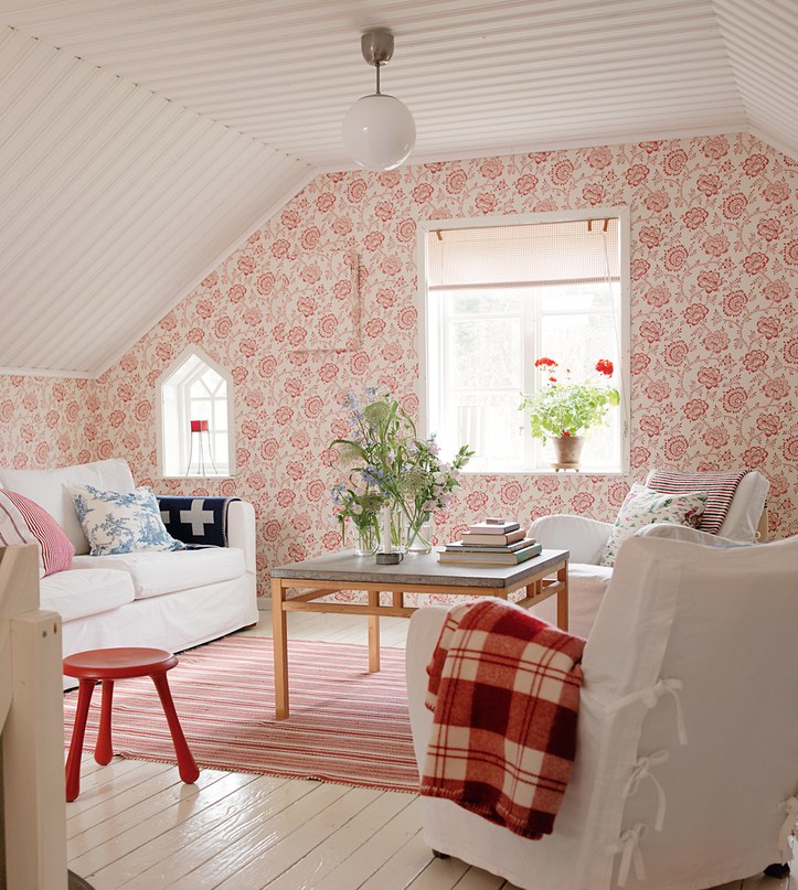Акцентные обои с цветочным рисунком . Небольшая мансардная спальня в Швеции едва вмещает две односпальные кровати. Но создание акцентной стены с обоями в цветочек старой розы (напоминающими мне бессарбские ковры) зрительно расширяет комнату. Светильник Tore Ahlsen Pia Lampan с вышивкой из хлопка и серебра — приятное дополнение, благодаря которому обои не выглядят такими тяжелыми и винтажными, как в посте All Over Print Passion .
