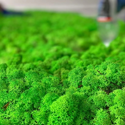 Идеален для создания объёмно-пространственных композиций, напоминающих природные ландшафты. Может также применяться в качестве дополнительного акцентного материала при создании зеленой стены из разнообразных стабилизированных трав. Прост в креплении на поверхность. Идеален для создания арт-объектов. Если Вы хотите создать стену или декор из такого мха, то цена составит от 35 000 за кв.м.