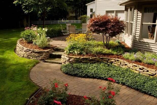Очень часто собственникам достаются участки с холмами, оврагами, склонами. Здесь на помощь приходит пластик. Рельеф будет формироваться фрагментарно, склон превратится в ступени с горизонтальной поверхностью, с помощью террасирования и подпорных стенок.