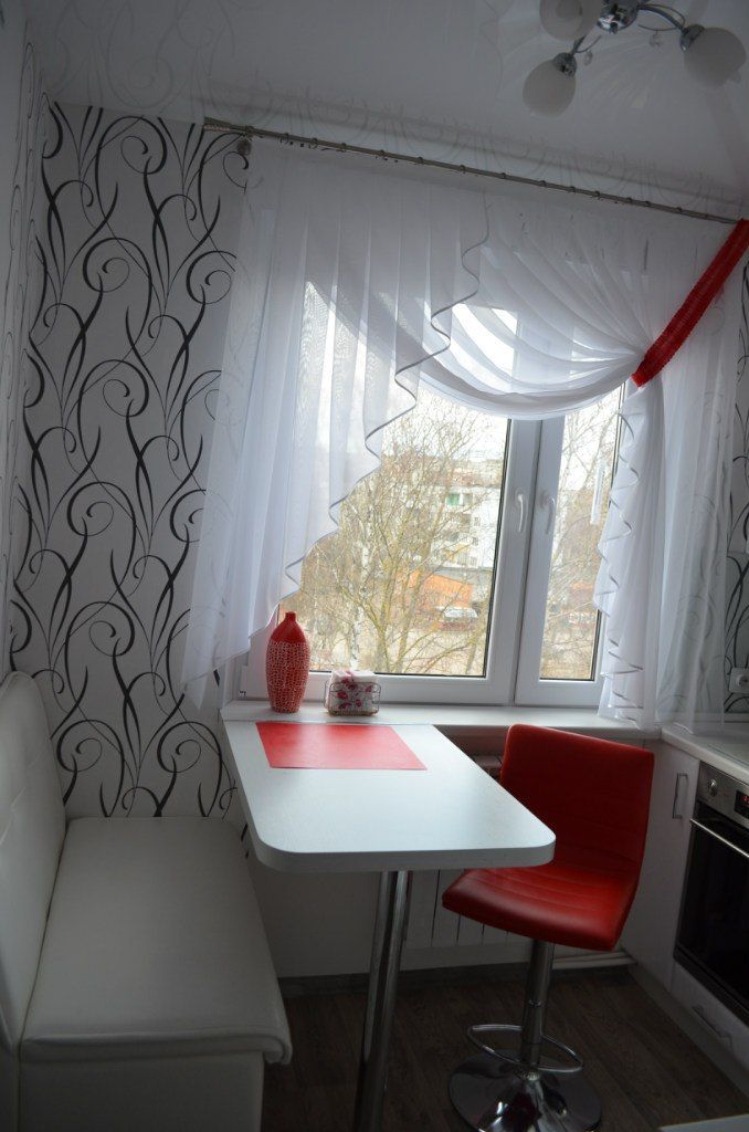 - можно сделать широкий подоконник, который в дальнейшем можно будет использовать для рабочей поверхности. В этом месте можно хранить различную бытовую технику — микроволновую печь, тостер, для этого достаточно поменять шторы на рулонные или римские;