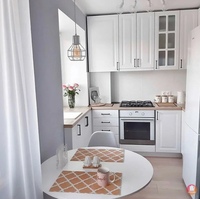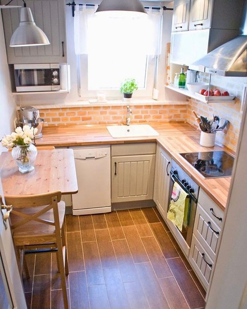 Удачным дизайнерским решением на маленькой кухне станет выполнение пространства в едином стиле, правильно расставленные акценты. Кухонная техника, мойки и другие рабочие поверхности располагаются рядом, на расстоянии около полутора метров друг от друга.Помещение не загромождено мебелью и хорошо освещено.
