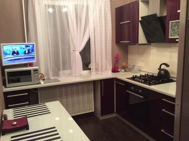 Столешница подоконник — отличное решение для маленькой кухни 6 квадратных метров. Маскирует батарею отопления, предоставляет место для хранения вещей, служит дополнительной для работы. Такой план столешницы избавляет от необходимости приобретать и размещать обеденный стол, а значит, значительно экономит место.