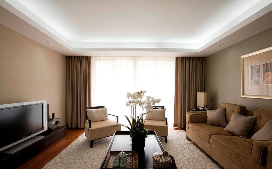 Сегодня можно повстречать натяжные потолки практически в каждом доме или квартире. Они обычно используются, чтобы спрятать или опустить слегка высокий стационарный потолок. Данный вариант отделки также играет декоративную роль, потому что скрытые в нем светодиоды прекрасно выделяют и освещают пространство. Натяжной потолок идеален для гостиной, он в любом интерьере создаст неповторимую атмосферу.