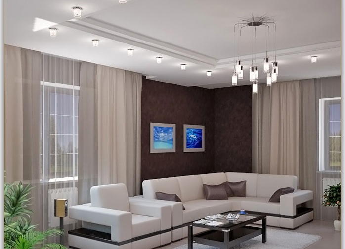 Как известно, свет в гостиной играет очень важную роль. Подвесной потолок — это удобное решение, которое можно использовать в большинстве домов. Наиболее популярными среди них являются конструкции, которые могут быть выполнены из гипсокартона, а также из металлических, деревянных, древесных или пластиковых панелей. Очень популярны натяжные потолки из специальных гибких пленок.
