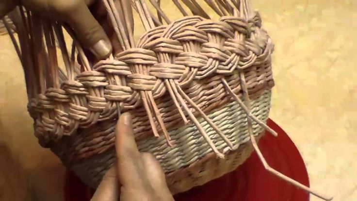 Начинаем круговое плетение. Когда одна трубочка закончена,вставляем в нее следующую,это предаст процессу плетения непрерывность. Поэтому изначально,при изготовлении трубочек-прутиков,делаем один конец трубки немножко уже. Кончик также смазываем клеем присоединении. Прищепки применяют ,чтобы зафиксировать трубочки при склеивании.