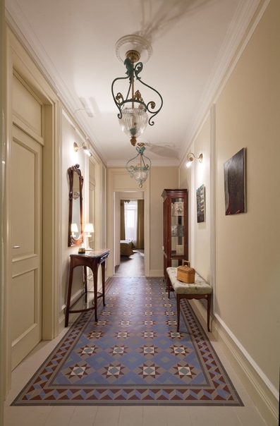 Для коридоров характерно использование цветных покрытий, выложенных в шахматном порядке или ромбиками по диагонали. Самыми популярными для таких помещений считаются модели серого, коричневого, бежевого, терракотового, темно-зелёного оттенка. При этом отдают предпочтение только матовой плитке.