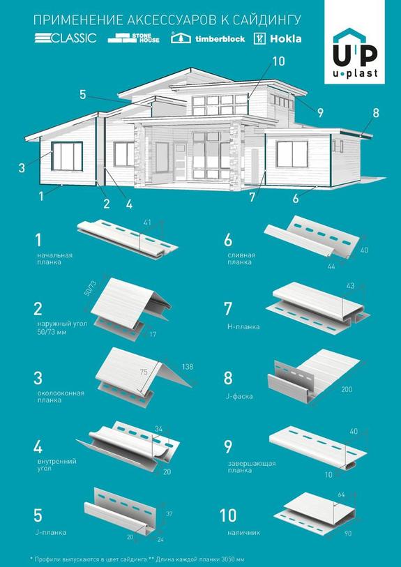 Совместно с сайдингом или панелями блок хаус, могут применяться соединительные элементы и элементы доборных конструкций.
