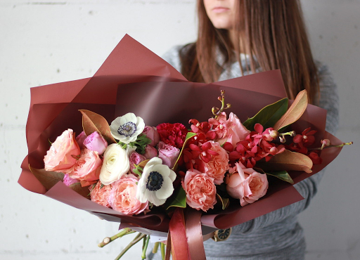 Флорист скомбинирует для вас красивый букет из разных цветов, завернув его красивой бумагой того или иного оттенка.