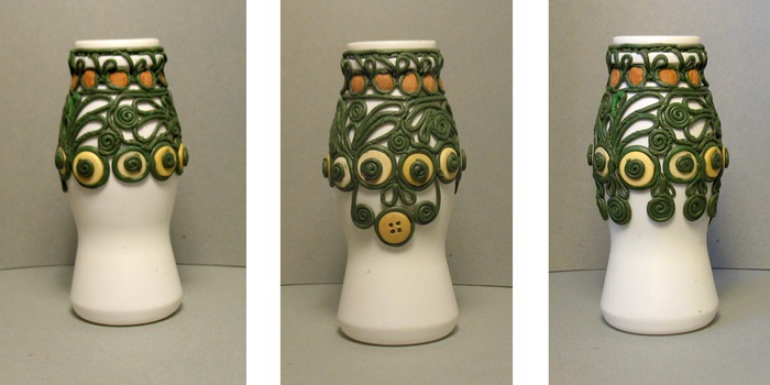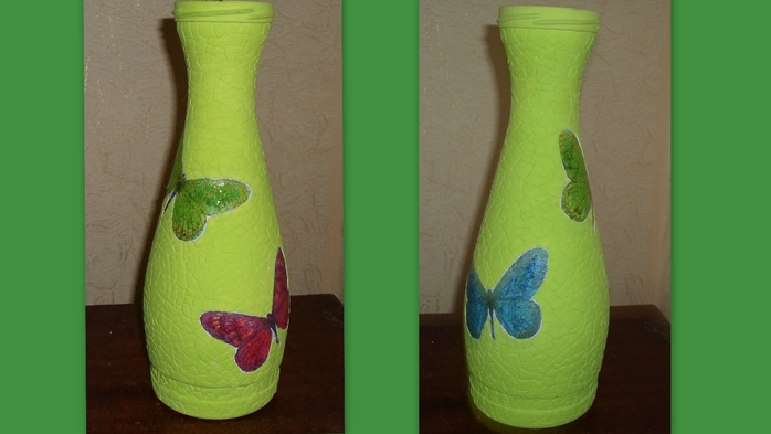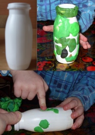 Из пластиковой бутылки получается очень яркая и веселая ваза для цветов. Сделать такую вазочку совсем не сложно! Отрезаем от пластиковой бутылки верхнюю часть. Раскрашиваем ее зеленой краской и приклеиваем сверху тесемку.