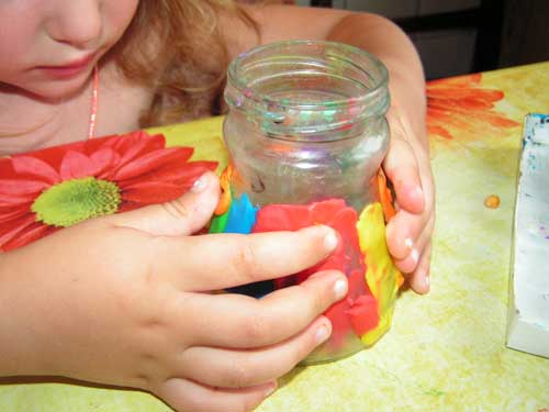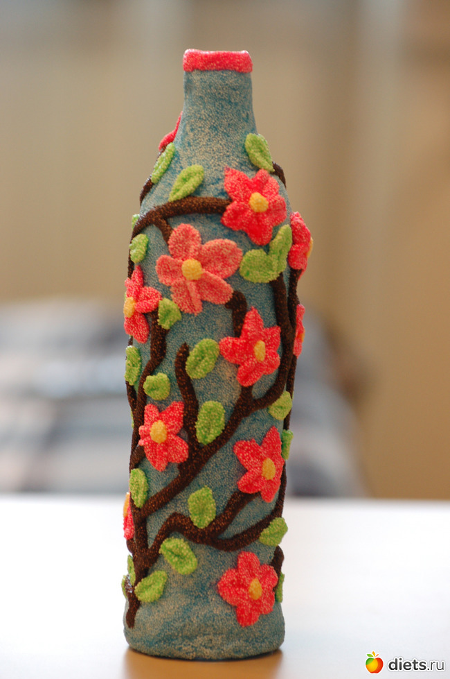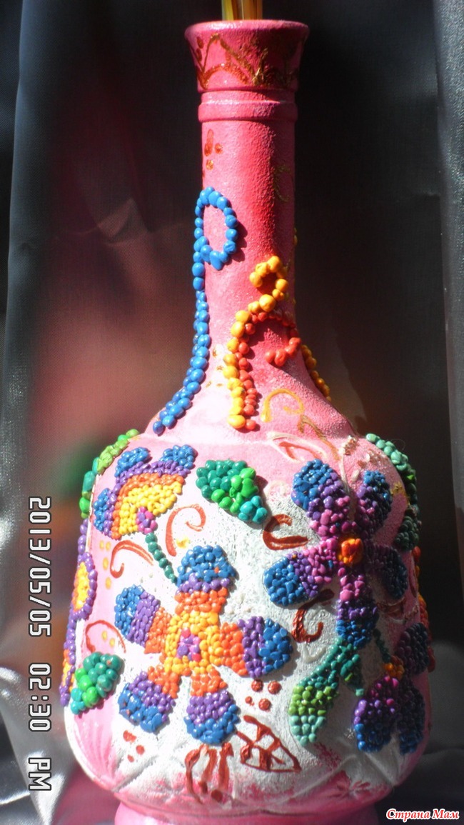 Рисуем на бутылочке цветы и украшаем их серединки бусинками.