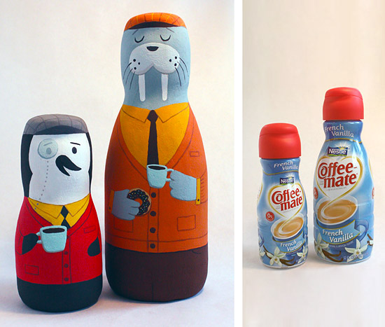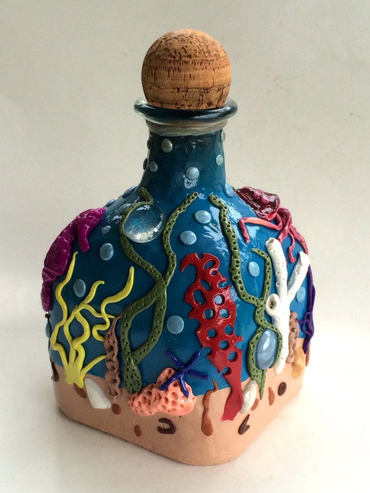 Приклеиваем глаза, нос и крыльяМилый осьминожек в миниатюрной шляпке изготавливается очень просто. Бутылку потребуется окрасить голубой краской, отрезать дно и нарезать нижнюю часть.